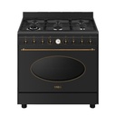 Piano de cuisson Sinfonia - Largeur 90 cm - Four �lectrique : 115 L - Multifonction Double chaleur tournante - 9 modes de cuisson dont Gril fort ventil� - Fonction D�cong�lation - Programmateur �lectronique - 5 niveaux de cuisson - Sonde de cuisson - Contre-porte plein verre avec vitre int�rieure d�montable - Porte 3 vitres - Eclairage halog�ne - Fonction de nettoyage Vapor Clean - Ventilation de refroidissement tangentielle - Table de cuisson en inox - Allumage de la table int�gr� aux manettes - 6 br�leurs dont un ultra-rapide double commande 4,2 kW - Support Wok en fonte fourni - S�curit� gaz par thermocouple - Grilles fonte - Coffre de rangement avec porte abattante - Finition noir mat.