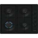 Table gaz Bosch POP6B6K30 Srie 2 60 cm - 4 foyers dont un puissant brleur rapide de 3 kW pour une cuisson efficace - Commandes latrales avec boutons ergonomiques offrant une prise en main confortable - Allumage lectrique intgr pour une utilisation pratique et scurise - Scurit thermocouple qui coupe automatiquement larrive de gaz en cas dextinction de la flamme - Surface en verre tremp noir, lgante et facile nettoyer - Grilles en acier robustes pour une stabilit parfaite des ustensiles - Compatible gaz naturel et butane/propane (injecteurs fournis) - Installation encastrable dans une niche standard - Un design raffin et moderne pour une cuisine lgante et fonctionnelle.