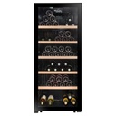 Cave � vin de service La Sommeli�re LS52BLACK - Compacte et �l�gante, cette cave pose-libre mono-zone offre une capacit� de 52 bouteilles type Bordeaux 75 cl - Sa plage de temp�rature r�glable de 5 � 20�C permet de mettre � temp�rature de d�gustation tous vos vins - Le panneau de contr�le digital ext�rieur facilite les r�glages sans perturber la temp�rature int�rieure - La porte vitr�e en double vitrage, verre tremp� trait� anti-UV, prot�ge vos bouteilles tout en les mettant en valeur gr�ce � l��clairage LED blanc froid - Les 3 clayettes et la demi-clayette en bois naturel, amovibles et anti-vibration, assurent un rangement stable et soign� - Le syst�me de refroidissement brass� garantit une temp�rature homog�ne - Fonctionnant � seulement 36 dB et class�e F avec une consommation annuelle de 105 kWh, elle combine discr�tion et efficacit� �nerg�tique - Son design All Black avec poign�e int�gr�e s�harmonise facilement avec tous les int�rieurs - Compatible avec l'application Vinotag : Acc�dez � une repr�sentation virtuelle d�taill�e.